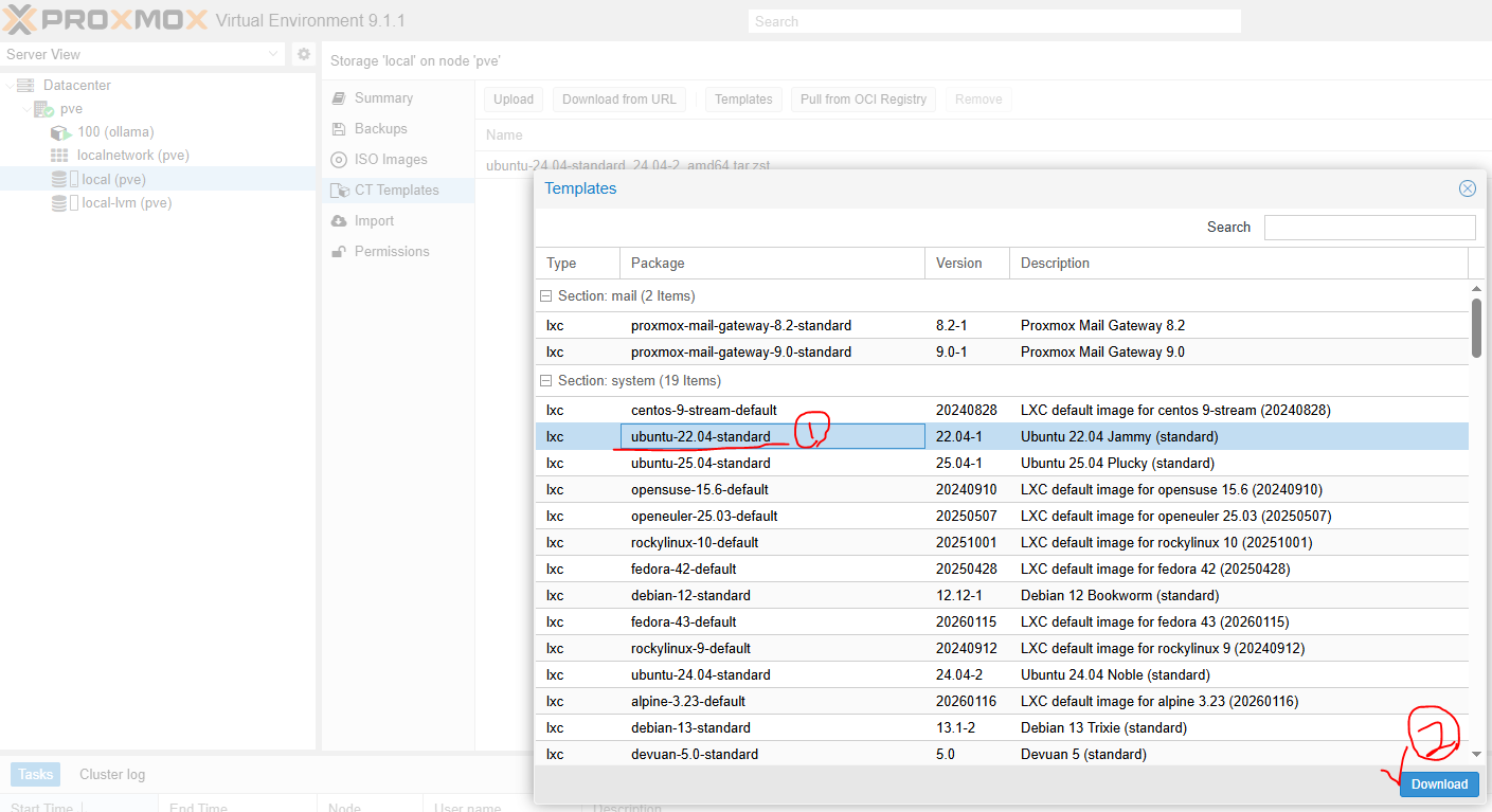 VM 만들어줄 때랑 똑같은 방식으로 만들어주되, Proxmox 패키지에서 Template 을 직접 다운로드를 먼저 해야한다. 참고로, Proxmox Version 에 따라 지원되는 Version 이 제한 되어있다.