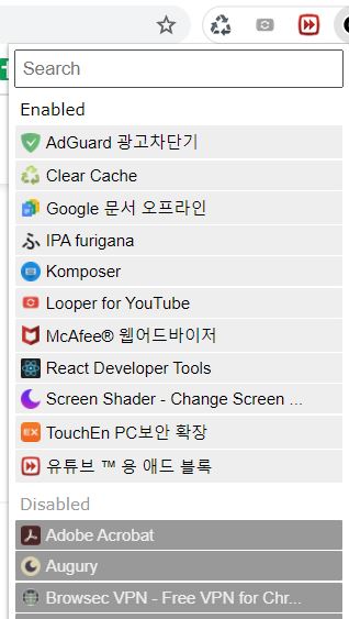 - 사용하는 확장 프로그램이 많을 경우, 검색하여 찾을 수 있고 활성화된 것들이 가장 상단에 나타난다.