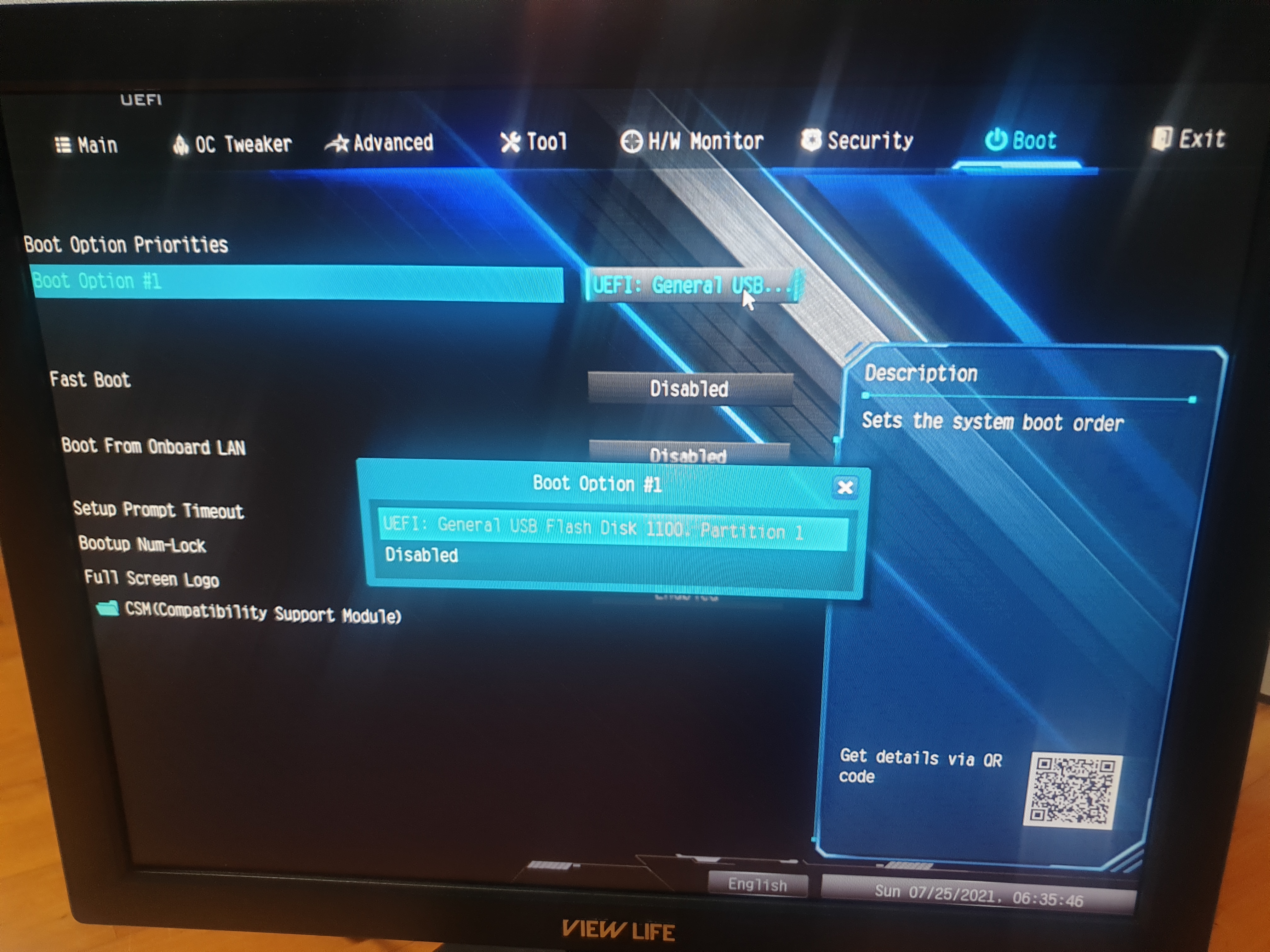 그렇게 되면 아래와 같은 모드로 들어가게 되는데 Boot Option 을 UEFI 로 선택해주고 EXIT 탭에서 Save 를 선택한다.